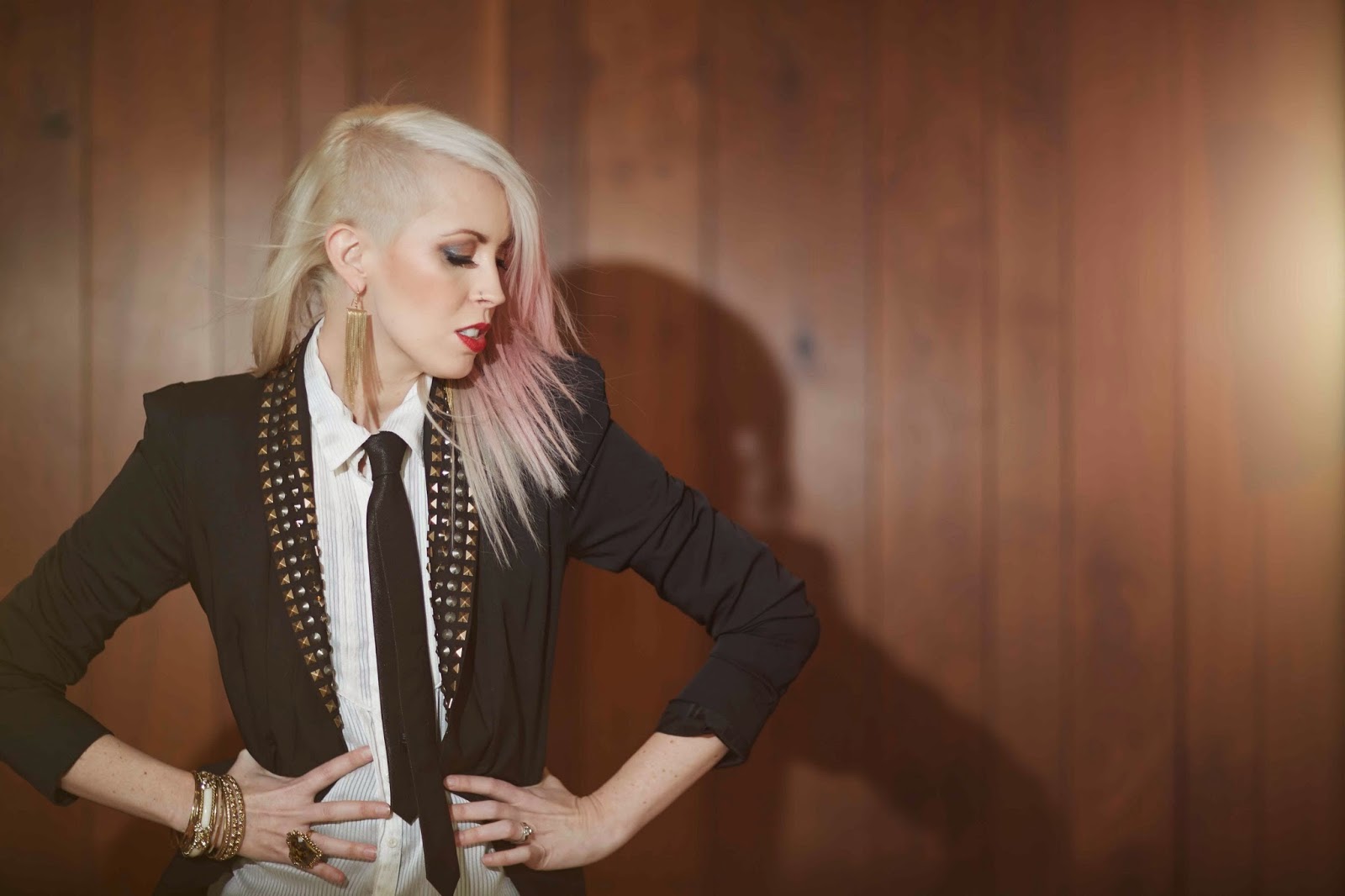 "black suit jacket, skinny black tie and white shirt? i feel like I've seen this before. lots of gold bangle bracelets and dangly earrings. striking a pose with hands on hips," he wrote. "bright red lips, hair shaved on one side, tips colored pink. this seems really familiar. oh wait! i know where i've seen this before!"